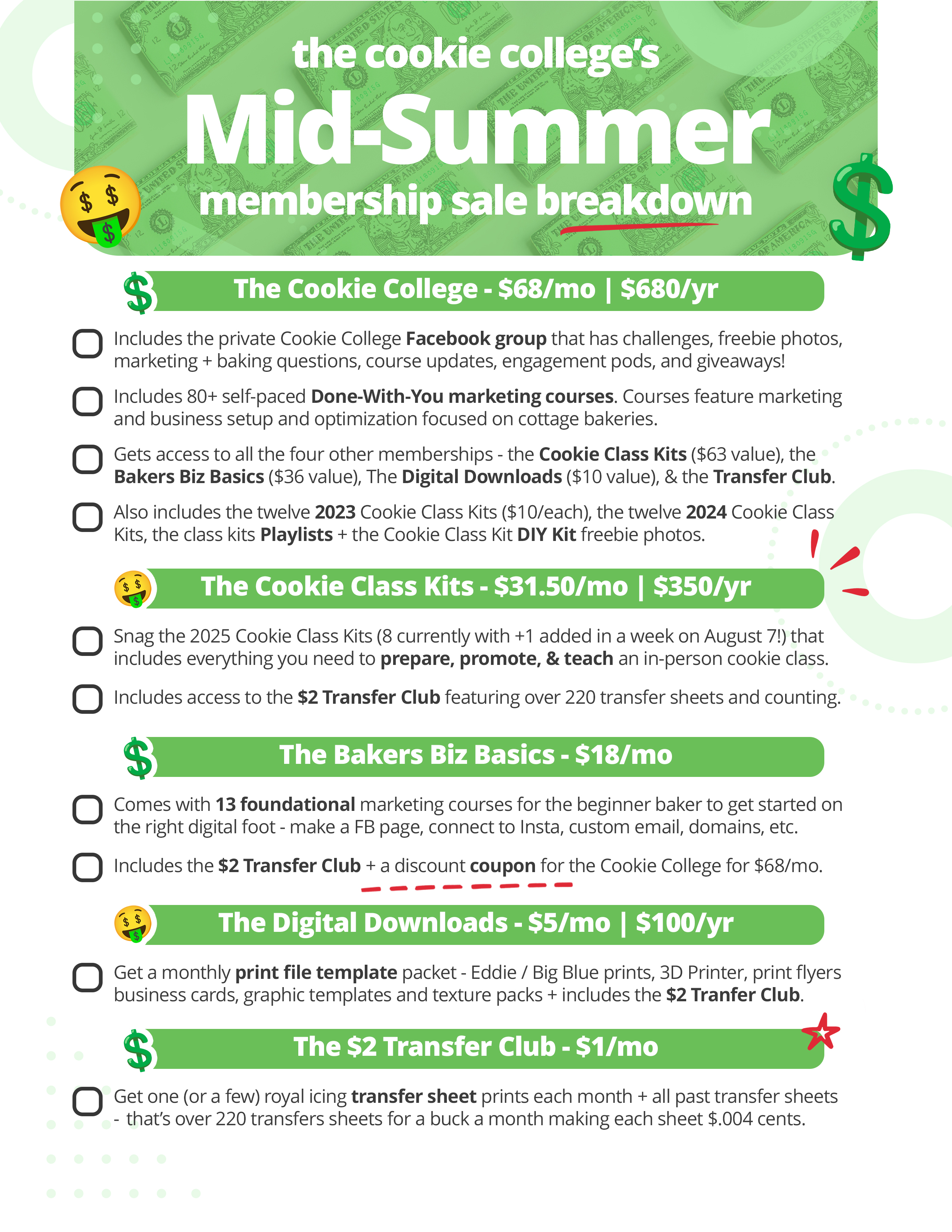 Additionally, The Cookie College ($68/mo | $680/yr) includes all of the content in our other memberships - so The Cookie Class Kits (2023 - 2025 class kits), The Bakers Business Basics, The Digital Downloads, and The $2 Transfer Club.